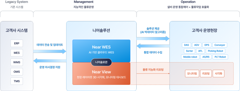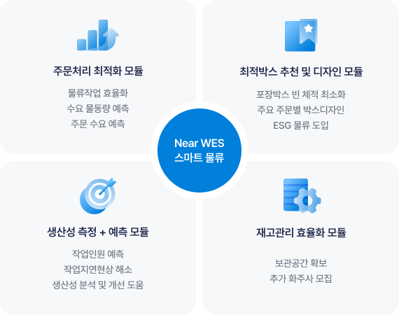 Near WES는 AI와 데이터, 알고리즘 기반의 물류 지능화 기술로 물류 전 과정을 효율화 ·최적화하여 물류 운영의 어려움을 해소하며,