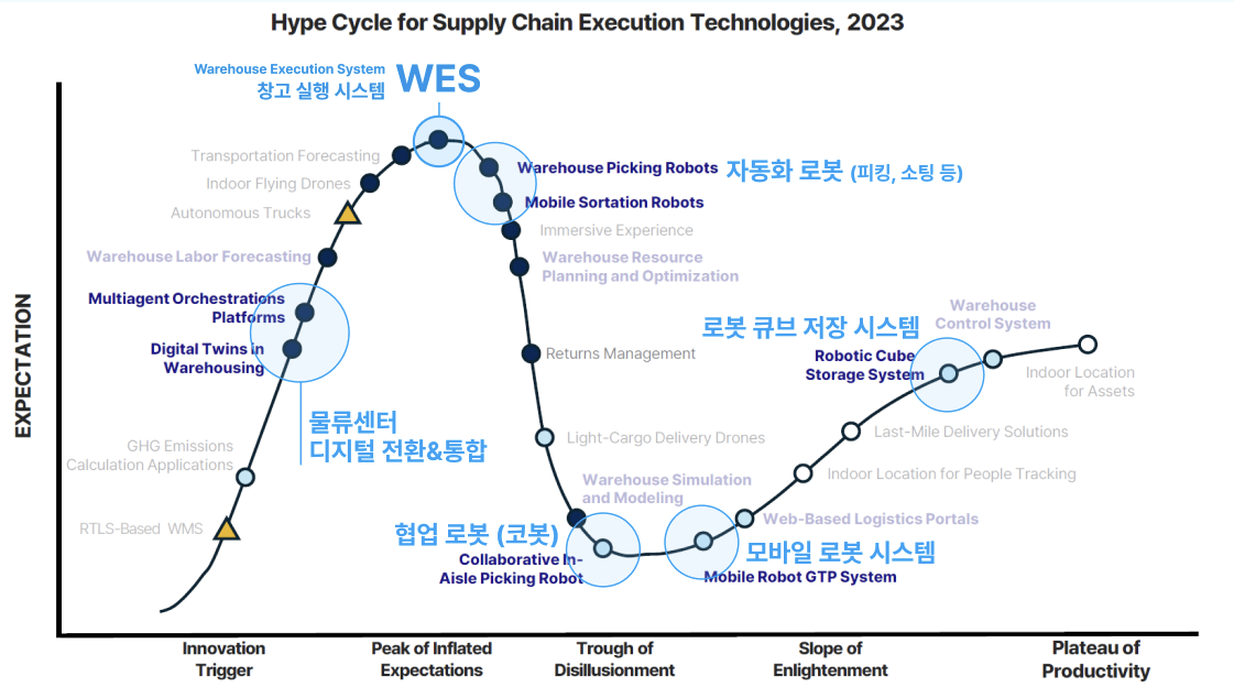 이를 대변하듯, 가트너는 WES (물류 실행 시스템)을 개발 정점에 오른 기술이자 가장 주목받고 있는 기술로 선정했습니다.